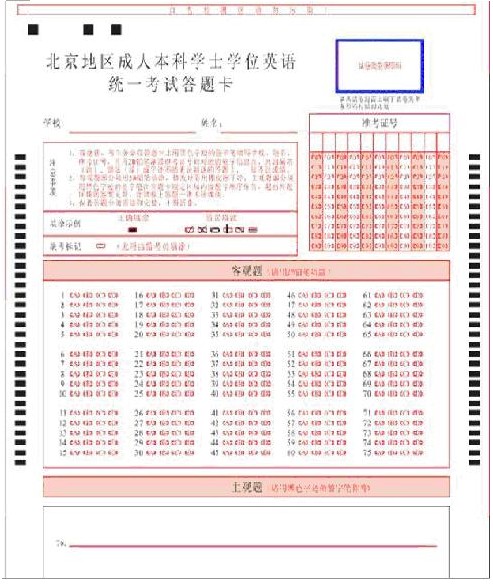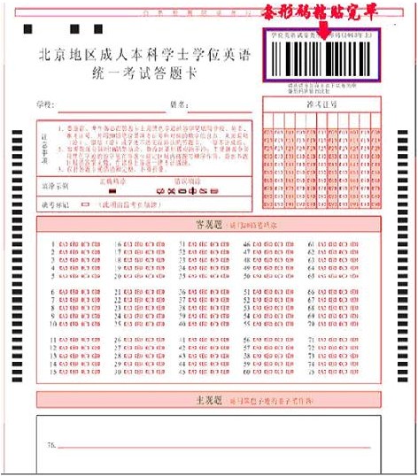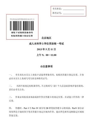 從08年4月開始北京地區(qū)成人本科學(xué)士學(xué)位英語統(tǒng)一考試實(shí)行網(wǎng)上閱卷,且從2013年5月開始學(xué)位英語考試開始實(shí)施“一題多卷”,即考試試題相同,題目順序被打亂,使用相同的答題卡,以試卷上的條形碼為區(qū)分。 (考生拿到試卷和答題卡后,請(qǐng)從試卷封面取下試卷類型條形碼,粘貼到答題卡指定位置。)新的試卷樣式見所附圖片:北京地區(qū)成人本科學(xué)士學(xué)位英語統(tǒng)一考試試卷(樣式)。