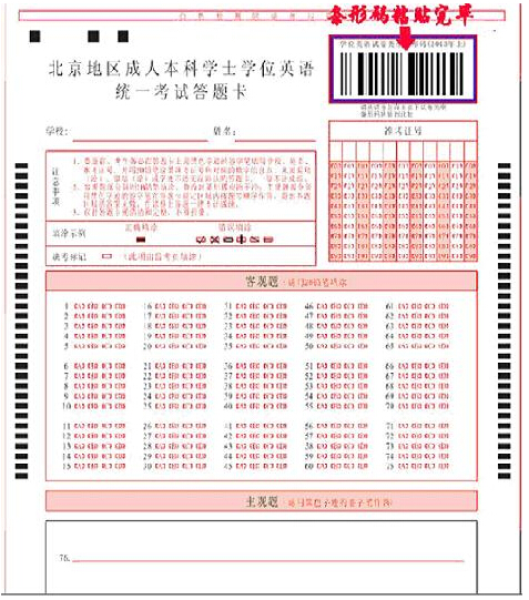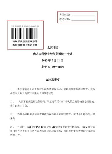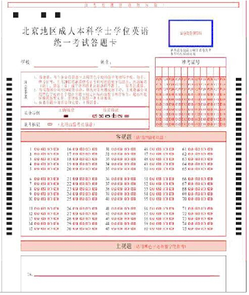 從08年4月開始北京地區(qū)成人本科學(xué)士學(xué)位英語統(tǒng)一考試實(shí)行網(wǎng)上閱卷,且從2013年5月開始學(xué)位英語考試開始實(shí)施“一題多卷”,即考試試題相同,題目順序被打亂,使用相同的答題卡,以試卷上的條形碼為區(qū)分。 (考生拿到試卷和答題卡后,請從試卷封面取下試卷類型條形碼,粘貼到答題卡指定位置。)新的試卷樣式見所附圖片:北京地區(qū)成人本科學(xué)士學(xué)位英語統(tǒng)一考試試卷(樣式)。