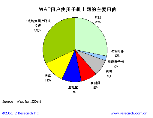 iResearch艾瑞市場(chǎng)咨詢根據(jù)Waplian統(tǒng)計(jì)數(shù)據(jù)顯示,WAP網(wǎng)站用戶使用手機(jī)上網(wǎng)的主要目的,有33%用戶為了下載鈴聲、圖片、游戲、視頻使用手機(jī)上網(wǎng),另外有11%用戶為了使用手機(jī)博客上WAP網(wǎng),泡社區(qū)有10%,看新聞8%,聊天8%,閱讀電子書有2%。
