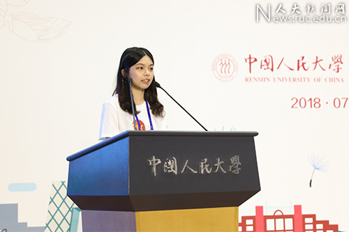 臺灣項(xiàng)目成員代表、臺灣政治大學(xué)教育系2015級本科生黃齡葦在發(fā)言中介紹了臺灣政治大學(xué)的建校歷史與辦學(xué)特色,并表示此次是其首次來到大陸,希望能在此次活動中增進(jìn)自身對北京文化、社會、經(jīng)濟(jì)的了解,與人民大學(xué)的同學(xué)們共同學(xué)習(xí)、互相交流,為促進(jìn)兩岸青年交流貢獻(xiàn)力量。
