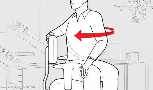 將右臂置于椅子背面,右手抓住椅背,左手抓住右膝或右邊扶手。