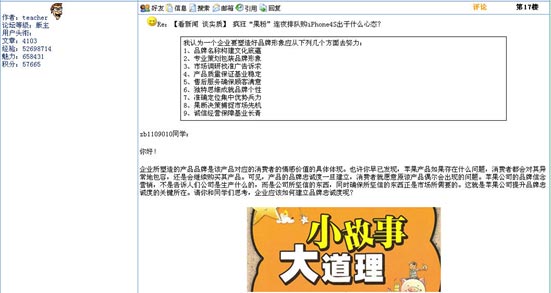 在以辯論的方式組織網(wǎng)絡(luò)“課堂”教學(xué)時(shí),我還引導(dǎo)學(xué)生觀察這樣一個(gè)現(xiàn)象,那就是,蘋果產(chǎn)品如果存在什么問(wèn)題,消費(fèi)者都會(huì)對(duì)其異常地包容,還是會(huì)繼續(xù)購(gòu)買其產(chǎn)品,以加深學(xué)生對(duì)蘋果公司品牌信念營(yíng)銷的理解。